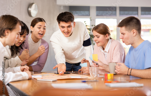 Fototapeta premium Group of happy teenagers friends playing board games