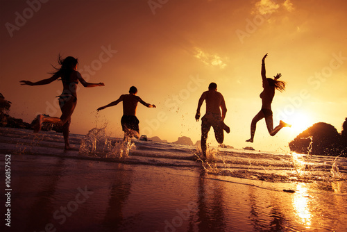 Fototapeta premium Group of happy young people is running on background of sunset beach and sea
