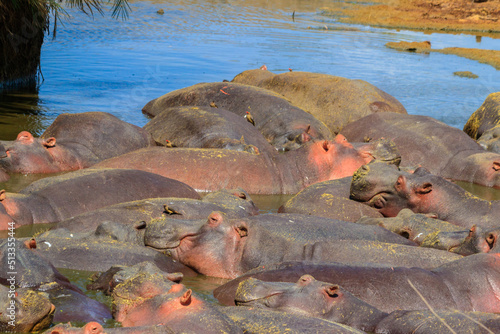 © olyasolodenko, Fototapeta premium Group of hippos (Hippopotamus amphibius) in a river in Serengeti National Park, Tanzania. Wildlife of Africa