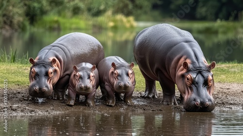 © AnuStudio, Fototapeta premium Group of hippos wading near a water body in a natural habitat.