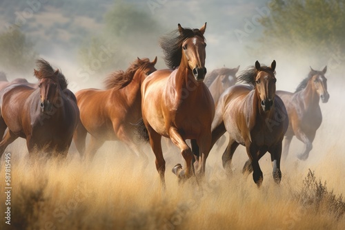 Fototapeta premium Group of horses galloping across a beautiful meadow Generative AI