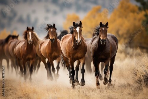 © ChaoticMind, Fototapeta premium Group of horses galloping across a beautiful meadow Generative AI