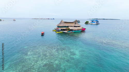 Fototapeta premium Group of houses floating in the sea on Tintipan Island in the San Bernardo Archipelago, Colombia.