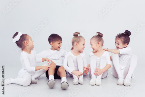Naklejka premium Group of kids boys and girls dancing at a white class room or studio smiling...