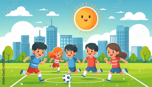 Fototapeta premium group of kids playing soccer on a sunny day flat design