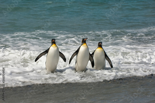 Obraz premium Group of King penguins (Aptenodytes patagonicus) emerging from the water, St....
