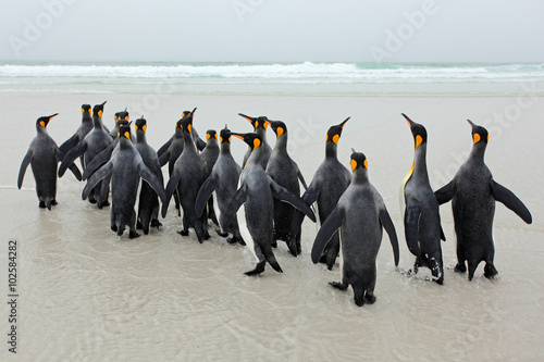 © ondrejprosicky, Obraz premium Group of king penguins coming back from sea tu beach with wave a blue sky