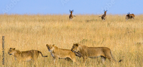 Obraz premium Group of lionesses in the Savannah. National Park. Kenya. Tanzania. Masai Mara. Serengeti. An excellent illustration.
