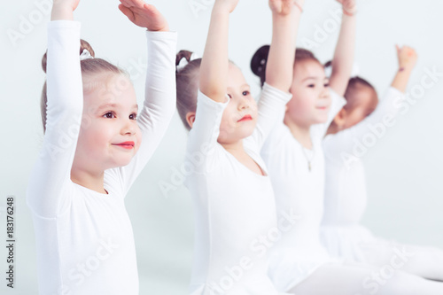 Naklejka premium Group of little girls are practicing at school of the ballet
