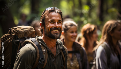 Obraz premium Group of men smiling, hiking in nature generated by AI