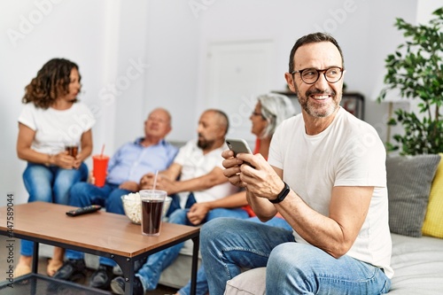 Fototapeta premium Group of middle age friends sitting on the sofa speaking. Man smiling happy using smartphone at home.