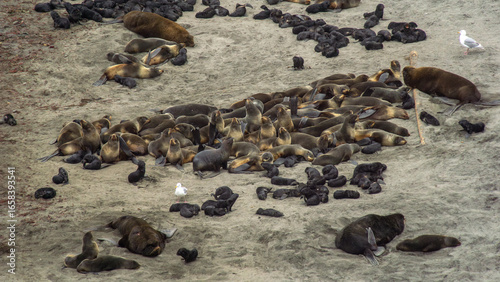 © Denis Tuev, Fototapeta premium Group of navy seals resting on sandy beach, showcasing various postures and interactions, with a few seagulls nearby, creating a lively coastal scene