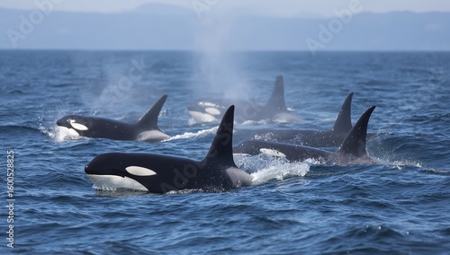 © Naim, Fototapeta premium Group of Orcas Swimming in Clear Blue Ocean with Heads Above Water and Visible Fins