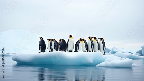 Obraz premium Group of Penguins on Iceberg, A colony of emperor penguins standing on a floating iceberg in Antarctica, overcast sky