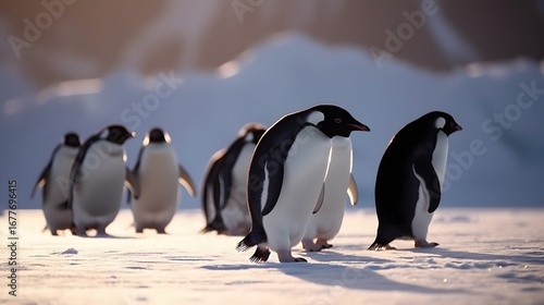 © shimul, Obraz premium Group of Penguins Walking Together on Icy Antarctic Terrain