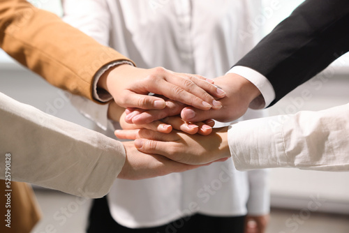 Obraz premium Group of people holding hands together indoors, closeup. Unity concept