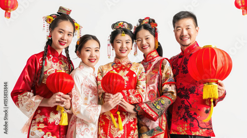 © Preeyada, Fototapeta premium Group of People in Traditional Chinese Attire Holding Red Lanterns Celebrating Festive Occasion with Joyful Expressions