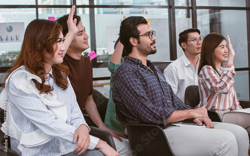 © Ann Rodchua, Fototapeta premium Group of people raising their hands and attending seminar