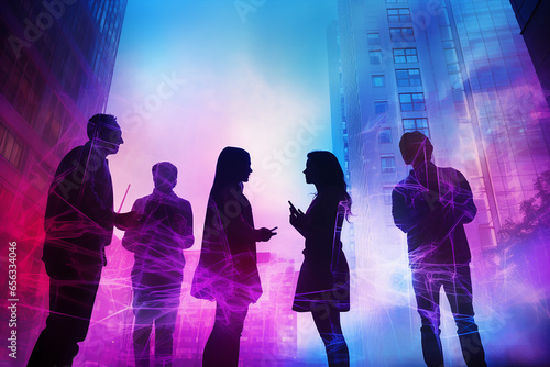 © aledesun, Fototapeta premium group of people silhouette holding and networking on mobile phones on a urban buildings commercial scenery, connection threads blue neon colors