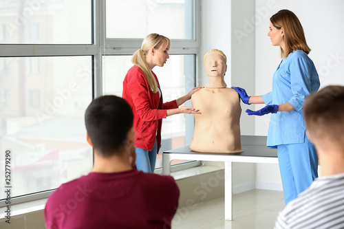 Obraz premium Group of people with instructor at first aid training course