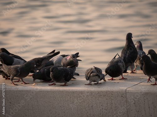 © hidako, Fototapeta premium Group of pigeon eating by the sea