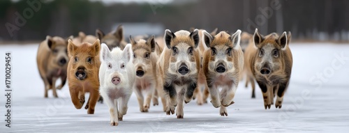 Naklejka premium Group of pigs running on a snowy landscape in winter, showcasing different...