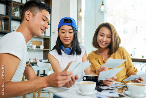 © Seventyfour, Fototapeta premium Group of positive young Asian people discussing printed photos when drinking coffee in cafe