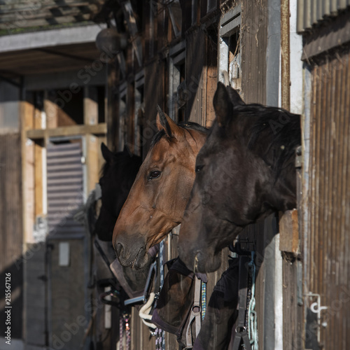 © igorgeiger, Fototapeta premium group of purebred beautiful horses stands in a stable in a stable.