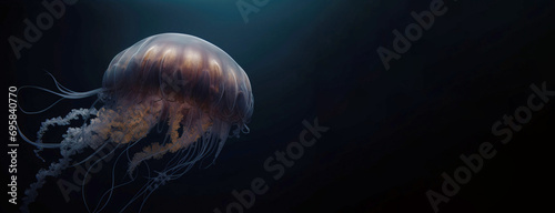 © Serhii, Fototapeta premium Group of rare colored jellyfish close-up, dark background. AI generated.
