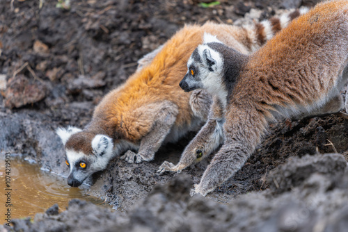 Fototapeta premium Group of ring-tailed lemurs drinking and grooming at muddy waterhole. Female...