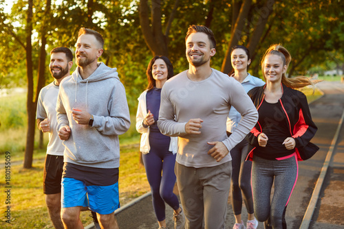 © Studio Romantic, Naklejka premium Group of runners jogging in park at morning. Healthy marathon of athletes in sportswear and sneakers running along path, team enjoying summer fresh air and outdoor cardio sport exercises in teamwork