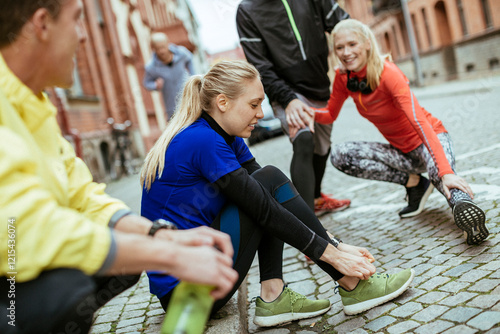 © Geber86, Fototapeta premium Group of runners stretching together before run outside