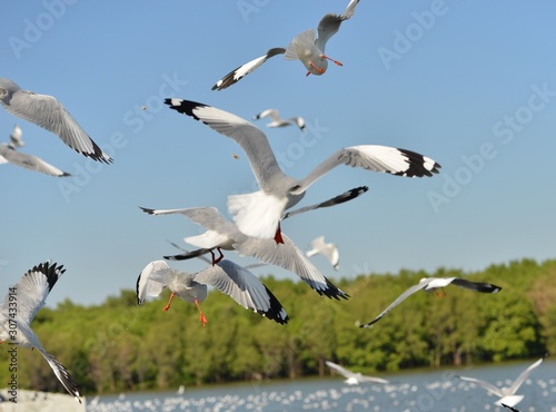 © angei535, Fototapeta premium Group of seagulls flying on the blue sky background closeup. Joyfully and beautifully.