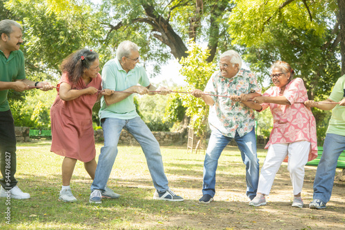 © GAJENDRRA BHATI , Fototapeta premium Group Of Senior Indian People Playing Tug War Outdoor In Park. Retirement life.