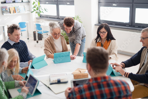 Obraz premium Group of seniors attending IT class in community centre with teacher