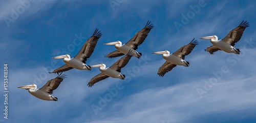 © Isyana, Obraz premium Group of seven pelicans soaring through a partly cloudy blue sky, wings outstretched