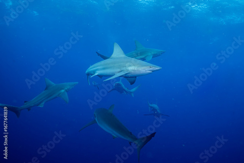 © Griffin, Naklejka premium Group of silky sharks in blue ocean