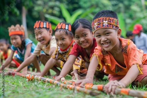 © Amni, Fototapeta premium Group of Smiling Children in Traditional Headwear Playing a Game