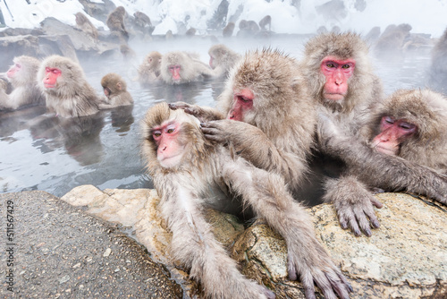 © Victoria, Naklejka premium Group of snow monkeys sitting in a hot spring at Jigokudani Yaen-Koen, Nagano Prefecture, Japan.