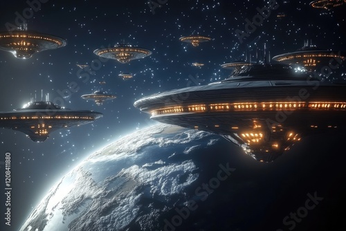 © Ева Поликарпова, Obraz premium Group of spaceships soaring through the sky on an alien planet