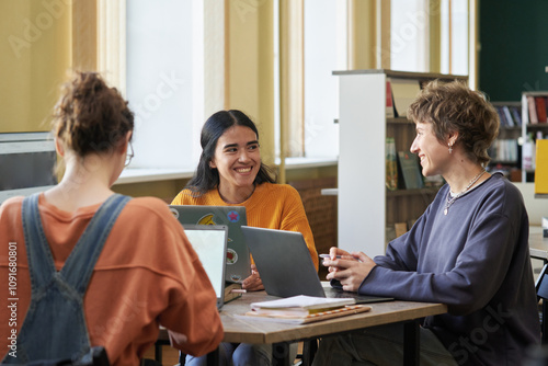 Fototapeta premium Group of students sitting at table in university library engaged in group discussion, using laptops and notebooks, with bookshelves in background