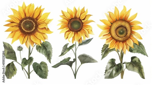 Obraz premium Group of sunflower illustrations with detailed leaves