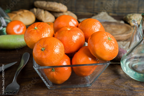 Fototapeta premium group of tangerines in glass bowl on classic rustic wood