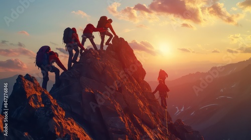 © Ibad, Fototapeta premium Group of team people helping work on peak mountain climbing teamwork , travel trekking winner success business concept