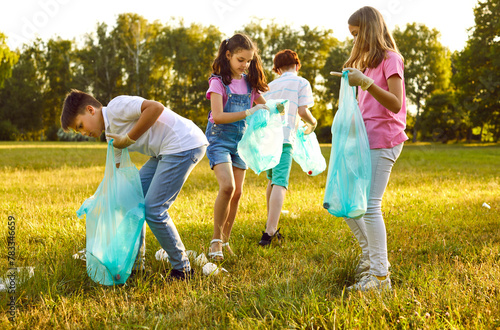 Fototapeta premium Group of teenage children volunteers with gloves and trash bags collecting...