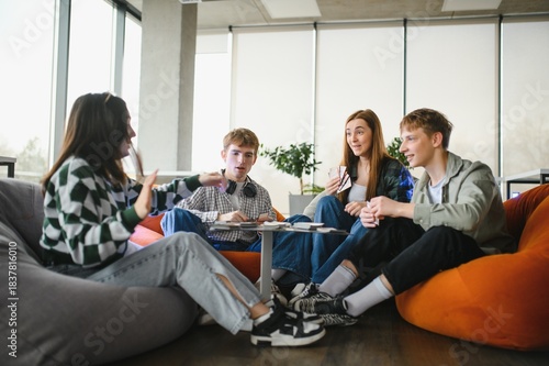 © Serhii, Obraz premium Group of teenagers playing cards on beanbag chairs