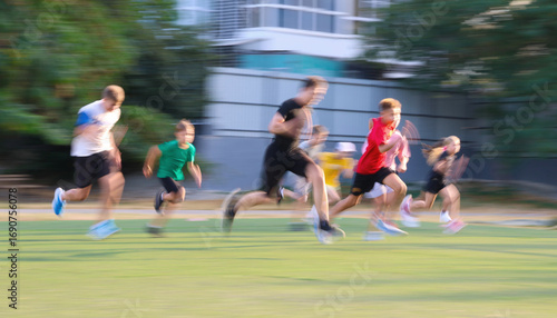 Obraz premium Group of teens running in green park. Blur.