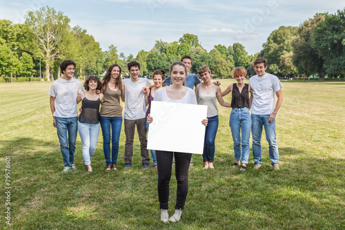© loreanto, Obraz premium Group of ten friends. A girl holds white copy space