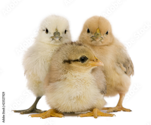 © Eric Isselée, Fototapeta premium Group of three chicks standing against white background