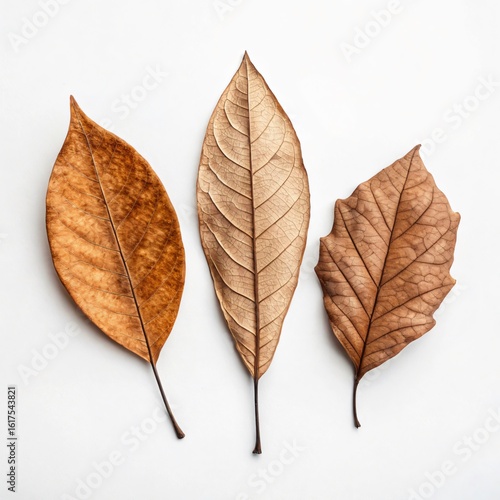 © Shabekunnahar, Fototapeta premium Group of Three Dry Leaves Arranged in Triangle on White